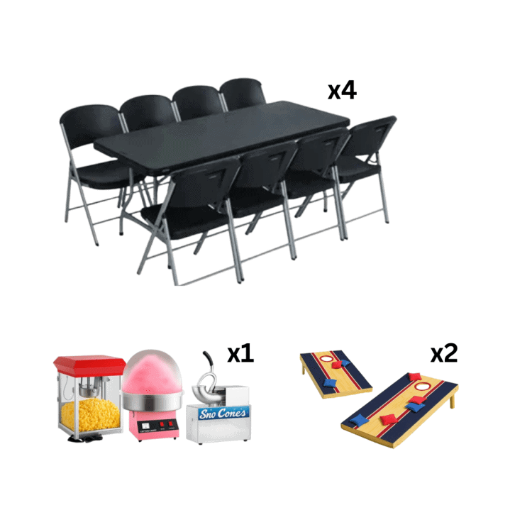 Make your party legendary! Ideal for medium to large gatherings where you want nonstop fun and tasty treats, this package adds extra seating, a concession machine, and a speaker to keep the vibe alive.