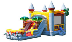 The T-Rex Dual Lane Combo (Wet or Dry) is a crowd-favorite that delivers BIG energy. Featuring a spacious bounce area, climbing wall, and dual racing slides, this unit doubles the fun and keeps kids entertained for hours.